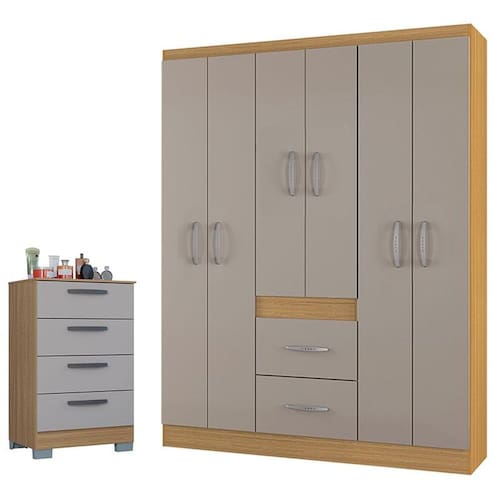 Começou a montar seu quarto? Então apresentamos para você este belo conjunto composto pela cômoda da linha 867 com o guarda roupa da linha Milão. A cômoda possui quatro gavetas equipadas com corrediças metálicas proporcionando uma abertura e fechamento suave. Os pés em plástico resistente garante mais estabilidade. Já o guarda roupa, com seis portas e duas gavetas equipadas com corrediças em plástico reforçado. Tanto a cômoda quanto o guarda roupa possui puxadores em plástico robusto, garantindo durabilidade. Fabricados pela Poquema, são desenvolvidos em MDP garantindo resistência e durabilidade. Com design moderno é perfeito para quem busca organização com estilo. Confira e aproveite!