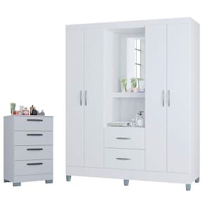 Cômoda 867 4 Gavetas com Guarda Roupa Solteiro Córdoba 4 Portas Branco Brilho - Poquema