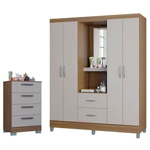 Cômoda 867 4 Gavetas com Guarda Roupa Solteiro Córdoba 4 Portas Castanho Off White - Poquema