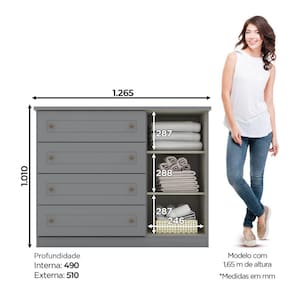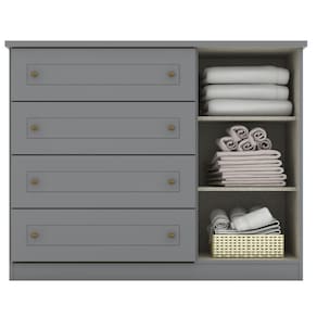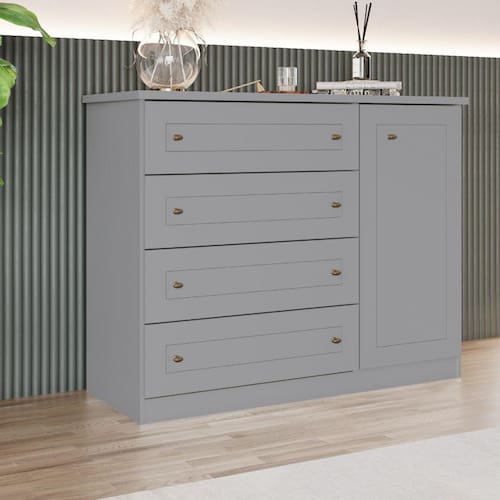 4 gavetas com corrediças telescópicas Puxadores em ABS MDP e MDF Frentes em MDF com usinagem em baixo relevo Dobradiça em metal Pintura UV