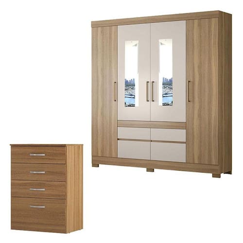 Guarda Roupa Casal 4 Portas Bilbao Amêndola Off White com Espelho - Demóbile