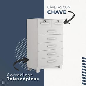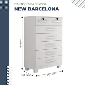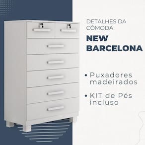 A Cômoda Barcelona completa seu quarto com muito charme e beleza, possui 7 gavetas muito espaçosa sendo 1 com chave com corrediças telescópica que dá muita suavidade e resistência, ainda conta com 2 portas e 2 prateleiras.