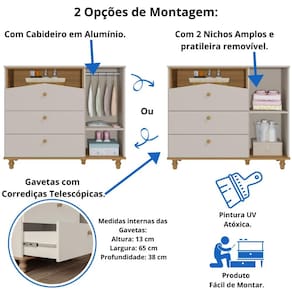 Seguindo o estilo lúdico, essa cômoda é perfeita para quem precisa de bastante espaço para organizar o enxoval dos pequenos.Possui nicho superior para organizar objetos de uso diário e 03 gavetas grandes com corrediças telescópicas que proporcionam deslizamento suave, maior abertura e melhor acesso às roupas. Possui também 01 porta de abrir com prateleira interna e 01 cabideiro para você montar de acordo com sua necessidade. Os puxadores e pés são torneados em madeira maciça e conferem um charme especial ao produto.O tampo possui bordas arredondadas que recebem pintura em laca com tinta atóxica e as peças retas recebem pintura UV também com tinta e verniz atóxicos.Fabricada com matéria-prima 100% MDF, um material ecologicamente correto e de ótima durabilidade e resistência.