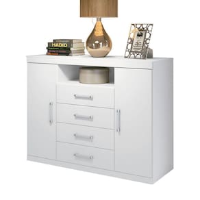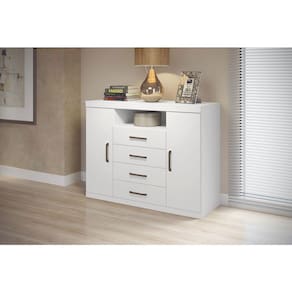 Esta cômoda é de uma proporção de espaço incrível! Possui duas portas: uma com cabideiro em alumínio, para pendurar: calças, camisas, camisetas...e a outra com prateleiras para guardar sapatos, caixas e demais objetos! Suas 04 amplas gavetas deslizam sobre corrediças metálicas com suavidade. E ainda possui espaço para colocar aparelhos eletrônicos e claro...uma TV sobre o tampo para sua comodidade (tampo suporta até 5 kg). São muitas funções em um só móvel!!!