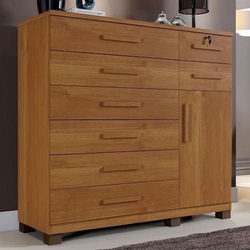 O(a) Cômoda Chicago 1 Porta 8 Gavetas Cinamomo - Loja é produzido em MDP na escala de brilho Fosco, e possui um grau de dificuldade de montagem: Médio.