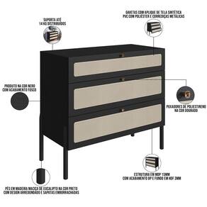 03 gavetas com corrediças telescópicas e aplique de tela sintética (PVC com poliéster).