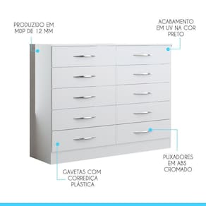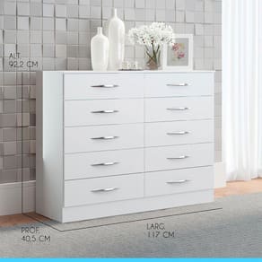 Cômoda Com 10 Gavetas Quarto Casal 117cm Mdp Menu Móveis Branco A Comoda foi desenvolvida pensando em atender todas as suas necessidades do dia a dia com um design atual, unindo versatilidade, conforto e beleza. Possui dez gavetas que sao perfeitas para manter tudo organizado. Produzido com materiais de excelente qualidade, garantindo a sua durabilidade. O melhor em moveis no design atual aliando conforto, qualidade e otimos precos, so na Menu Moveis! Caracteristicas: Marca: Menu Moveis Material: Produzido em MDP de 12 mm Acabamento: UV Gavetas: 10 Corredica: Plastica Puxadores: ABS Cromados