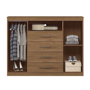 Cômoda Com 2 Portas E 4 Gavetas Havana Master Santos Andirá Jatoba A Comoda Master e de um espaco incrivel para o seu quarto, seja ele de casal, solteiro ou juvenil! Sem falar em seu design: muito pratico. Possui duas portas, uma porta com cabideiro em aluminio, para pendurar: calcas, camisas, camisetas...e a outra porta com prateleira para guardar sapatos, caixas, decoracao e demais objetos! Suas 4 amplas gavetas deslizam sobre corredicas metalicas com suavidade para guardar suas roupas com muita organizacao. E ainda possui espaco para colocar aparelhos eletronicos e claro, para sua comodidade um aparelho de TV sobre o tampo. Sao muitas funcoes em um so movel. Todo quarto precisa ter essa comoda! Caracteristicas Estrutura: MDP 12mm e 15mm Acabamento: Pintura Quantidade e Tipo de Portas: 2 Tipo de Dobradicas/Trilhos: Dobradicas Metalicas Simples Quantidade de Gavetas: 4 Tipo de Corredicas: Metalicas Tipo de Puxadores: Plastico ABS Quantidade e Tipo de Cabideiros: 1 em Aluminio Quantidade de Prateleiras: 1 Suporte ate: 30kg no tampo, 10kg no nicho e 3kg por gaveta. Manutencao: Nao limpar com alcool ou qualquer outro produto quimico, utilize somente pano seco ou levemente umedecido. Sistema de Montagem: Cavilhas, Parafusos e Minifix Itens Inclusos: 1 Comoda, Kit ferragens e Manual de montagem Garantia de Fabrica: 3 meses