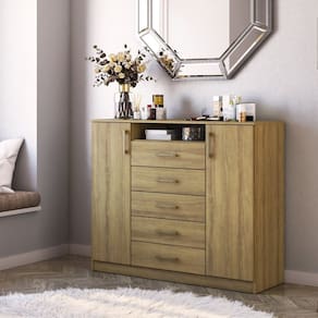 Otimize o espaço no seu quarto com a Cômoda Quebec com duas portas e 5 Gavetas, uma escolha funcional e elegante para armazenar suas roupas e pertences com praticidade e amplo espaço, adicionando um toque de sofisticação ao seu ambiente. Acabamento da Gaveta: Finish Foil Acabamento da Porta: Finish Foil Acabamento da Prateleira: Finish Foil Ambiente Principal: Quarto Complexidade da Montagem: Baixa: pode ser montado por uma pessoa sozinha Cor: Mel Cor do Produto: Mel Cor Flex: Não Cor Interna: Mel Escala de Brilho: Fosco Escala de Brilho da Gaveta: Fosco Escala de Brilho da Porta: Fosco Escala de Brilho da Prateleira: Fosco Gaveta com Chave: Não Itens Inclusos: 1 cômoda e manual de montagem Linha ou Coleção: QUARTO Manual de Montagem e Instalação: https://product-hub-prd.madeiramadeira.com.br/911766/documents/1a5e74cb-7c8d-4988-a62e-e34b33cf85332035402522517178026907425.pdf Material da Gaveta: MDP Material da Porta: MDP Material da Prateleira: MDP Material do Fundo: MDF Material do Puxador da Gaveta: PVC Material do Puxador da Porta: PVC Material Principal: MDP Montagem Flex: Não Necessita Montagem: Sim Origem do Produto: Nacional Peso: 61,7 kg Peso Máximo por Gaveta: 5 kg Peso Máximo por Prateleira: 10 kg Possui Espelho: Não Possui Nichos: 01 Possui Pés: Não Possui Portas: Sim Possui Prateleiras: Sim Quantidade de Gavetas: 05 Gavetas Quantidade de Prateleiras: 02 Prateleiras Recomendações de Uso, Manutenção e Limpeza: Para a limpeza do móvel utilizar pano levemente umedecido com água e sabão neutro Sapatas Niveladoras: Não Sistema de Montagem: Parafusos, cavilhas e minifix Suporta Até (kg): 40 kg Tipo de Corrediça da Gaveta: Metálica Simples Tipo de Dobradiça/Corrediça da Porta: Metálica Tipo de Porta: Bater Tipo de Puxador da Gaveta: Externo Tipo de Puxador da Porta: Externo Marca: Mademovel