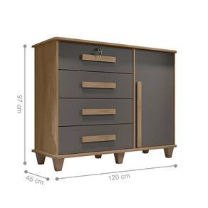 Com 4 gavetas de corrediças metálicas possui acabamento interno em linho, e puxadores em madeira nas gavetas e na porta, que conta também com dobradiças metálicas.