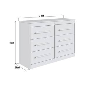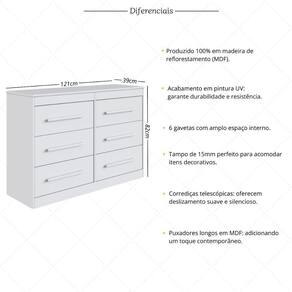 São 6 gavetas (suportam até 5kg em cada) equipadas com corrediças telescópicas que promovem abertura completa e silenciosa. A combinação perfeita entre organização e praticidade para guardar roupas e acessórios com facilidade. Com puxadores longos em MDF, esta cômoda une funcionalidade e estilo, adicionando um toque contemporâneo ao espaço.