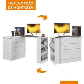 Requer montagem: Sim | É em forma de L: Sim | Profundidade: 75,6 | Materiais da escrivaninha: MDP | Altura: 76 | Largura: 129 | Comprimento: 129 | Quantidade de caixas de embalagem: 1 | Tipo de móvel: Cômoda Cor: Branco