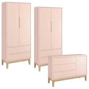 Cômoda com Porta e 2 Peças Guarda Roupa Infantil New Classic Rosa com Pés Madeira Natural - Reller