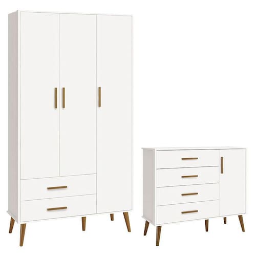 Cômoda com Porta e Guarda Roupa Infantil 3 Portas Isis Branco Acetinado - Reller