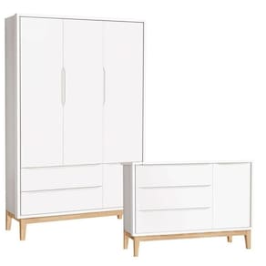 Cômoda com Porta e Guarda Roupa Infantil 3 Portas New Classic Branco com Pés Madeira Natural Reller