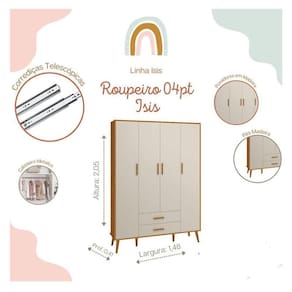 Guarda Roupa Infantil 4 Portas Isis Areia Acetinado Savana - Reller