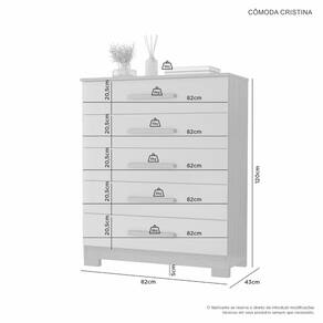 Características: Marca: JCM Movelaria Modelo: Cômoda Cristina 100% MDP Pés em PVC 5 Gavetas com corrediça telescópica Puxadores de Madeira Tampo de 18mm