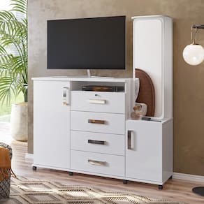 Aliada a organização do seu dormitório, a Cômoda Copacabana Lukaliam vai garantir um dia a dia mais otimizado e um ambiente bem decorado. Vem com espelho giratório e porta objetos atrás, que oferece praticidade para visualizar o look e permite fazer a maquiagem com seus itens necessários mais acessíveis. A cômoda para quarto conta com 02 portas e espaço interno para sapatos e objetos, onde uma das partes possui cabideiro em alumínio, ideal para pendurar e guardar calças e camisas. Possui prateleira removível e um nicho para eletrônico ou decoração, proporcionando versatilidade na organização. Essa comoda com sapateira tem 04 gavetas com corrediças telescópicas e trava no fundo da gaveta, que oferecem mais segurança ao abrir, evitando que elas saiam completamente do móvel. A cômoda com gavetas tem o tampo resistente que suporta colocar televisores ou aparelho de som. Os puxadores cromados no formato ergonômico, trazem um visual mais arrojado e fácil de manusear. Fabricada com madeira MDF/MDP a comoda com espelho tem uma estrutura de alta durabilidade que concilia praticidade para montar e desmontar o móvel garantindo sua vida útil. A pintura U.V. e acabamento fosco dessa cômoda de madeira, garante um aspecto novo por mais tempo, sem contar os pés em rodízio que merecem destaque por trazer a praticidade em mudar o móvel de lugar, além de proporcionar mais facilidade na limpeza do ambiente. Agora é só combinar a Cômoda Copacabana Lukaliam com o restante do mobiliário e conquistar o quarto dos seus sonhos. Cor: Branco Cor: Branco