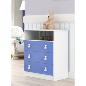 Cômoda de Bebê 3 Gavetas 1 Nicho Arco-íris DJD Móveis Branco/Azul. A cômoda Arco-íris DJD chega para deixar o quarto do seu bebê ainda mais charmoso e completo. Ela tem 3 espaçosas gavetas e um nicho para facilitar a vida de papais e mamães. É produzida em MPD com corrediças metálicas e lindos puxadores em forma de ursinho. Ean: 7908506276352