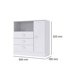 Cômoda de Bebê 3 Gavetas 1 Porta 1360 Baby Móveis Percasa Branco. Cômoda em MDP BP branco 15 mm (nas laterais e prateleira), acabamento laca nas frentes de gavetas e porta. Possui quatro gavetas com corrediça telescópica e uma porta com dobradiças metálicas. A cômoda é fabricada em MDP 15 mm. Ean: 7898519564747