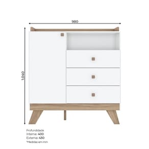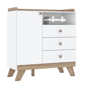 - A Cômoda pode ser usada como trocador na parte de cima. Acabamento da Gaveta: Pintura UV Acabamento da Porta: Pintura UV Acabamento da Prateleira: Pintura Texturizada UV Acompanha a Almofada: Não Altura dos Pés: 10 cm Ambiente Principal: Quarto de Bebê codigo_ean: 7900288246202 Complexidade da Montagem: Média: pode ser montado por mais de uma pessoa e/ou necessite de maior conhecimento para montagem Cor: Branco/Jequitibá Cor do Produto: Branco/Jequitibá Escala de Brilho: Fosco Escala de Brilho da Porta: Fosco Escala de Brilho da Prateleira: Fosco Gaveta com Chave: Não Itens Inclusos: 1 Cômoda, Kit Ferragens e Manual de Montagem Linha ou Coleção: Noah Manual de Montagem e Instalação: https://cdn2.madeiramadeira.com.br/atributo/henn-infantil-e-bebe-cozinha/3245397-3266-17591527083047.pdf Marca: Espresso Móveis Material da Gaveta: MDF/MDP Material da Porta: MDF/MDP Material da Prateleira: MDF/MDP Material do Fundo: MDF/MDP Material dos Pés: MDF Material Principal: MDF/MDP modular: Não Necessita Montagem: Sim Origem do Produto: Nacional Peso: 31 kg Peso Máximo por Gaveta: 3 kg Peso Máximo por Prateleira: 8 kg Possui Espelho: Não Possui Nichos: Não Possui Pés: 05 Possui Portas: Sim Possui Prateleiras: Sim Possui Trocador: Sim Quantidade de Gavetas: 03 Gavetas Quantidade de Prateleiras: 01 Prateleira Recomendações de Uso, Manutenção e Limpeza: Para limpeza de seu móvel, use uma flanela limpa e seca. Não utilize produtos químicos que possam danificar o produto. Sapatas Niveladoras: Não Sistema de Montagem: Parafusos e Cavilhas Suporta Até (kg): 41 kg Tipo de Corrediça da Gaveta: Metálica Telescópica Tipo de Dobradiça/Corrediça da Porta: Metálica Tipo de Puxador da Gaveta: Externo Tipo de Puxador da Porta: Externo