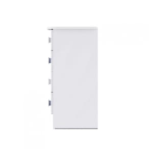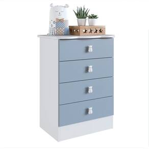 Cômoda em MDP BP branco 15 mm (nas laterais e prateleiras), acabamento laca nas frentes de gaveta. Gavetas com corrediça telescópica. Puxador na Cr branca. Utilizada em quarto de bebê ou infantil. Puxador em formato de urso. Acabamento: Finish Foil Acabamento da Gaveta: Laca Acompanha a Almofada: Não Altura: 81,5 cm Ambiente: Quarto de Bebê Ambiente Principal: Quarto de Bebê Complexidade da Montagem: Média: pode ser montado por mais de uma pessoa e/ou necessite de maior conhecimento para montagem Cr: Branco/Azul Cr: Branco/Azul Cr Interna: Branco Escala de Brilho: Brilhante Escala de Brilho da Gaveta: Brilhante Estilo: Moderno Gaveta com Chave: Não Itens Inclusos: 1 Cômoda e Manual de Montagem. Largura: 59,5 cm Linha ou Coleção: Baby Material da Gaveta: MDP Material do Fundo: THDF Material do Puxador da Gaveta: Plástico Material Principal: MDP Necessita Montagem: Sim Peso: 22,6 kg Peso Máximo por Gaveta: 2 kg Possui Espelho: Não Possui Gavetas: 04 Possui Nichos: Não Possui Pés: Não Possui Portas: Não Possui Prateleiras: Não Possui Rodízio: Não Possui Trocador: Não Profundidade: 40 cm Recomendações de Uso, Manutenção e Limpeza: É recomendado pano macio para limpezas do dia-a-dia, e pano úmido para tirar a poeira. Sapatas Niveladoras: Não Sistema de Montagem: Parafusos e cavilhas. Tipo de Corrediça da Gaveta: Metálica Telescópica Tipo de Puxador da Gaveta: Externo