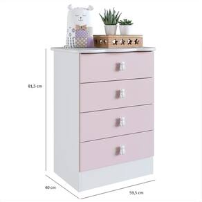 Cômoda em MDP BP branco 15 mm (nas laterais e prateleiras), acabamento laca nas frentes de gaveta. Gavetas com corrediça telescópica. Puxador na cor branca. Utilizada em quarto de bebê ou infantil. Puxador em formato de urso. Acabamento: Finish Foil Acabamento da Gaveta: Laca Altura: 81,5 cm Ambiente: Quarto de Bebê Complexidade da Montagem: Média: pode ser montado por mais de uma pessoa e/ou necessite de maior conhecimento para montagem Cr: Branco/Rosa Cr: Branco/Rosa Cr Interna: Branco Escala de Brilho: Brilhante Escala de Brilho da Gaveta: Brilhante Estilo: Moderno Gaveta com Chave: Não Itens Inclusos: 1 Cômoda e Manual de Montagem. Largura: 59,5 cm Linha ou Coleção: Baby Material da Gaveta: MDP Material do Fundo: THDF Material do Puxador da Gaveta: Plástico Material Principal: MDP Necessita Montagem: Sim Peso: 22,6 kg Peso Máximo por Gaveta: 2 kg Possui Espelho: Não Possui Gavetas: 04 Possui Pés: Não Possui Portas: Não Possui Prateleiras: Não Profundidade: 40 cm Recomendações de Uso, Manutenção e Limpeza: É recomendado pano macio para limpezas do dia-a-dia, e pano úmido para tirar a poeira. Sapatas Niveladoras: Não Sistema de Montagem: Parafusos e cavilhas. Tipo de Corrediça da Gaveta: Metálica Telescópica Tipo de Puxador da Gaveta: Externo