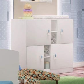 Cômoda de Bebê 4 Portas Móveis Percasa Branco. Cômoda 4 portas, fabricada em mdp bp branco 15 mm (nas laterais), acabamento lacca nas portas. Puxador na cor branca com detalhes em branco, rosa e azul. Ideal para quarto infantil, possuindo excelente espaço interno. Ean: 7898519567380