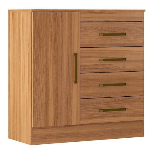 Cômoda De Madeira 4 Gavetas Montevidéu Demóbile Amendola A Cômoda Montevidéu Demóbile tem design moderno e sofisticado, possui 04 gavetas com corrediças metálicas, que oferecem mais leveza ao movimento de abrir e fechar as gavetas. Essa cômoda com sapateira conta ainda com 01 porta e espaço interno com prateleira, ideal para guardar roupas, sapatos e objetos pessoais. A cômoda para quarto tem o tampo resistente que suporta colocar televisores ou até mesmo aparelho de som. Os puxadores retos na cor bronze, trazem um visual discreto e elegante ao produto. Essa cômoda com gavetas Demóbile é fabricada com madeira MDP, uma estrutura de alta durabilidade que pode ser montada e desmontada sem danificar o móvel garantindo assim sua vida útil. A cômoda de madeira com pintura e acabamento fosco, garante um aspecto por mais tempo, além de proporcionar mais praticidade no dia a dia facilitando a limpeza. Preencha seu quarto com graça, charme e estilo com a Cômoda 4 gavetas Montevidéu Demóbile. NA