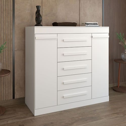 O(a) Cômoda Divino 2 Portas 5 Gavetas 100% Mdf Branco - Loja é produzido em 100% MDF na escala de brilho Brilhante e Semi-Brilho, e possui um grau de dificuldade de montagem: Médio.