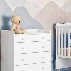 Diferencial !! Gavetas com corrediças metálicas e excelente profundidade Puxadores duplos em plástico poliestireno com formato de estrela, que deixará seu ambiente mágico Pés opcionais para evitar o contato do produto com o chão Bordas com um ótimo acabamento em perfil PVC Trocador embutido que garante mais praticidade no dia a dia Excelente acabamento revestido em pintura UV, que dá maior destaque à cor Sistema anti-tombamento para evitar riscos de acidentes Estrutura produzida com materiais de alta qualidade