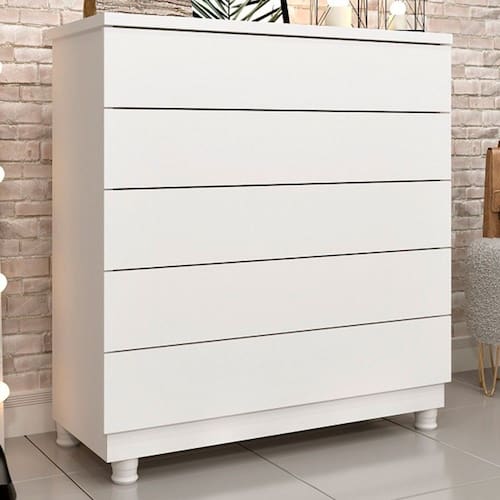 O(a) Cômoda Dona Premium 5 Gavetas Neve - Pnr Móveis é produzido em MDF na escala de brilho Fosco, e possui um grau de dificuldade de montagem: Médio.