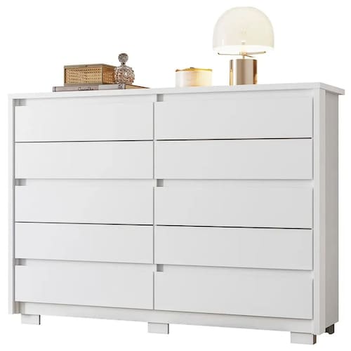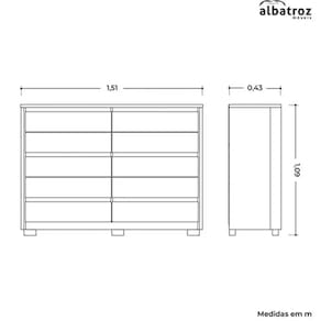 Cômoda Duetto 10 Gavetas Albatroz Renove o seu espaço com a Cômoda Duetto 10 Gavetas Albatroz. Ela possui uma estrutura sólida em MDP e acabamento em pintura UV. Suas 10 gavetas deslizam suavemente graças às corrediças telescópicas, proporcionando fácil acesso aos seus pertences. O tampo e as molduras de 25mm conferem robustez ao design, enquanto o amplo espaço interno oferece espaço de sobra para organizar suas roupas, acessórios e objetos pessoais. Além disso, os pés garantem estabilidade e segurança ao móvel. Transforme o seu ambiente com a praticidade e elegância da Cômoda Duetto, levando funcionalidade e estilo para o seu espaço.\nMEDIDAS\nAltura 109 cm\nLargura 151 cm\nProfundidade 43 cm\nCARACTERÍSTICAS\nModelo Cômoda Duetto\nTipo do produto Cômoda 10 Gavetas\nGarantia 3 meses\nMaterial MDP / Tampo e molduras de 25mm\nTipo de Corrediça Telescópica\nTipo de Puxador Embutido\nFabricante Albatroz\nQuantidade de Gavetas 10\nPossui Chave Não\nNecessita Montagem Sim\nAcompanha Manual de Instalação Sim\nINFORMAÇÕES IMPORTANTES\nObjetos decorativos que porventura apareçam na foto, não acompanham o produto. Não nos responsabilizamos pela montagem/instalação dos produtos.\nMontagens, desmontagens e instalações são responsabilidades do cliente. Indicamos que contrate uma empresa de montagem ou um montador de sua confiança.\nAlém disso, favor verificar se os pés e acessórios estão dentro do forro inferior do produto. Em suma, todas as informações divulgadas sobre o produto são de responsabilidade do Fabricante.\nAs cores do produto podem variar de acordo com o seu monitor, a iluminação do ambiente em que você está e até mesmo a sua percepção visual. Além da cor, pequenos detalhes e acabamentos podem não ficar evidentes na foto, por isso as imagens são meramente ilustrativas.