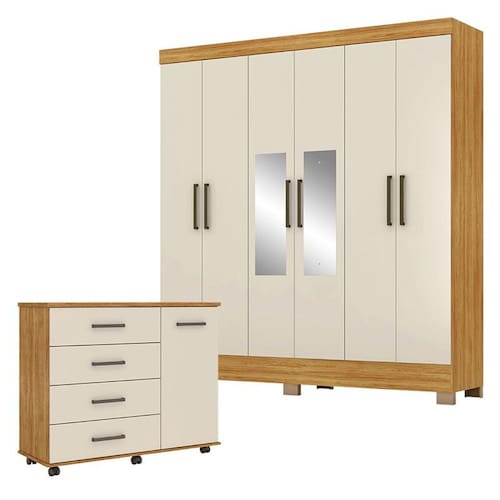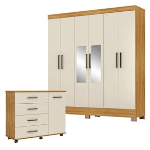 Cômoda Flora e Guarda Roupa Casal Prático Cinamon Touch Off White com Espelho – Demóbile