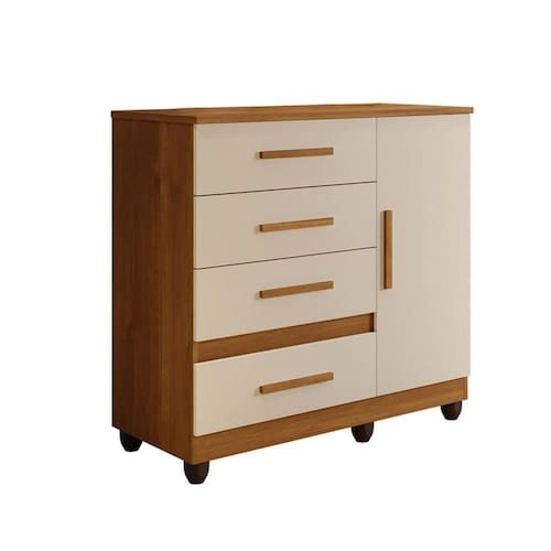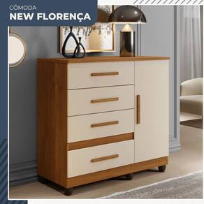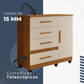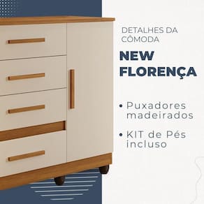 Feito com materiais de alta qualidade e design exclusivo, ele é o complemento perfeito para a decoração da sua casa. A cômoda Florença com seu lindo design trás charme e elegância a qualquer espaço, contém 1 porta e 1 prateleira para acomodar seus acessórios, além de possuir 4 gavetas com corrediça telescópica que proporciona uma maior suavidade em seu uso, ideal para pequenos espaços.