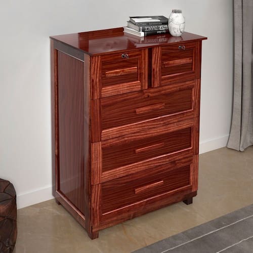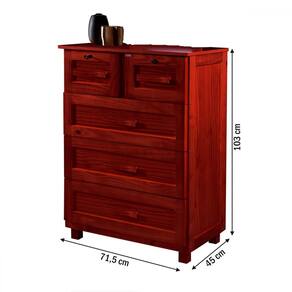 O(a) Cômoda Floripa Madeira Maciça 5 Gavetas Marrom - Pnr Móveis é produzido em Pinus e HDF na escala de brilho Fosco, e possui um grau de dificuldade de montagem: Médio.