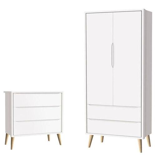 Cômoda Gaveteiro Infantil e Guarda Roupa 2 Portas Theo Branco Acetinado Pés Madeira Natural ? Reller