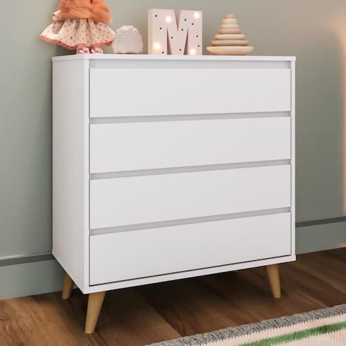 Cômoda Infantil Gaveteiro para Quarto de Bebê 100% MDF | 4 Gavetas Puxador Cava Pés Palito em Madeira Maciça Anti-Tombamento