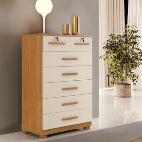 Cômoda Gaveteiro New Bacelona 7 Gavetas - Benetil Cinamomo Off A Comoda New Barcelona e uma peca que une charme e elegancia a qualquer ambiente. Com design sofisticado e estrutura robusta em chapa de 15 mm, oferece durabilidade e firmeza. Suas sete gavetas, duas delas com chave para seguranca extra, e corredicas telescopicas garantem suavidade e praticidade no uso diario, mantendo roupas e acessorios organizados de forma impecavel. Produzida com a tecnologia MDP Perfect, combina sustentabilidade com inovacao, oferecendo alta durabilidade e facil manutencao. A pintura UV, alem de resistente, e ecologicamente responsavel, feita com madeira de reflorestamento, promovendo um mobiliario sustentavel e elegante. Caracteristicas: Material Principal Mdp Espessura Da Chapa: 15 Mm Escala De Brilho: Semi Brilho Acabamento: Pintura UV Sistema De Montagem: Parafuso, Cavilha E Cantoneiras Metalicas Quantidade de Gavetas: 07