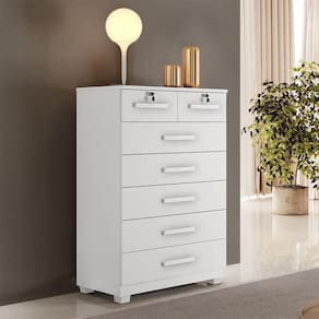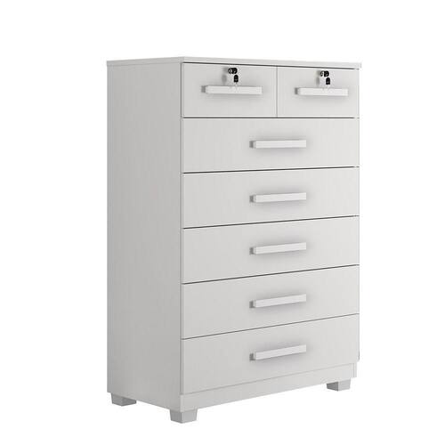 Cômoda Gaveteiro New Espanha 7 Gavetas - Benetil Branco A Comoda New Espanha e uma peca que une charme e elegancia a qualquer ambiente. Com design sofisticado e estrutura robusta em chapa de 15 mm, oferece durabilidade e firmeza. Suas sete gavetas, duas delas com chave para seguranca extra, e corredicas telescopicas garantem suavidade e praticidade no uso diario, mantendo roupas e acessorios organizados de forma impecavel. Produzida com a tecnologia MDP Perfect, combina sustentabilidade com inovacao, oferecendo alta durabilidade e facil manutencao. A pintura UV, alem de resistente, e ecologicamente responsavel, feita com madeira de reflorestamento, promovendo um mobiliario sustentavel e elegante. Caracteristicas: Material Principal Mdp Espessura Da Chapa: 15 Mm Escala De Brilho: Semi Brilho Acabamento: Pintura UV Sistema De Montagem: Parafuso, Cavilha E Cantoneiras Metalicas Quantidade de Gavetas: 07