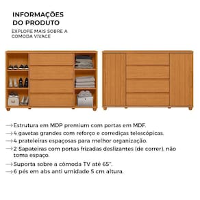 Design inteligente, praticidade e estilo definem a Cômoda Vivace. Versátil e funcional, é ideal para quem busca otimizar o espaço e manter tudo sempre organizado, seja no quarto, closet ou até mesmo na sala, servindo também como base para TVs de até 65?. Adapta-se facilmente a diferentes estilos de decoração, valorizando o ambiente com um visual moderno e elegante.