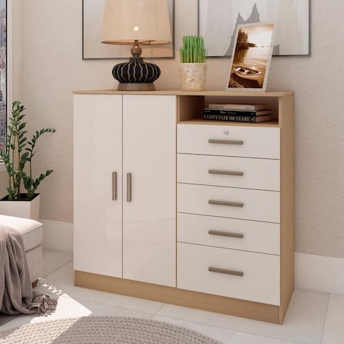 A Cômoda Genialflex Guatemala é aquela peça curinga que transforma o ambiente com charme e muita praticidade. Com design moderno e elegante, ela combina o aconchego do acabamento Freijó com a leveza do Off White, deixando o espaço mais bonito e organizado. São 2 portas e 5 gavetas super espaçosas, perfeitas para guardar roupas, acessórios e tudo o que você precisa ter à mão no dia a dia.