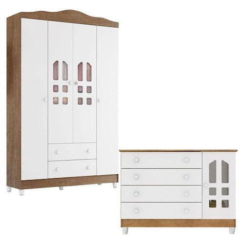 Cômoda Gran Selena e Guarda Roupa Infantil New Selena 4 Portas Branco Brilho Carolina