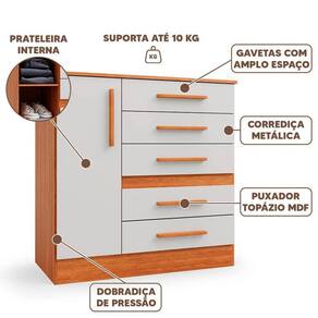 5 Gavetas que Suportam 5kg: Oferecem amplo espaço de armazenamento para roupas e objetos pessoais, cada uma suportando até 5kg de peso.