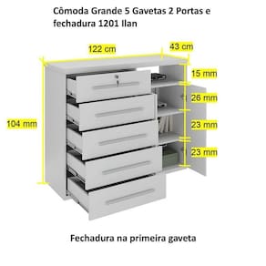 Cômoda Grande 5 Gavetas 2 Portas E Fechadura 1201 Ilan Carvalho * Imagens meramente ilustrativas. Cômoda enorme e multifuncional com 5 gavetas bem grandes com corrediças telescópicas, sapateira com 2 prateleiras, espaço para roteador/game ou para guardar objetos. - Fechadura na ira gaveta; - Sapateira; - Espaço para roteador/game ou organizador; - Tampo com 30mm de espessura - Puxadores resistentes; - 5 gavetas amplas e com corrediças telescópicas e reforçadas; DIMENSÕES DO PRODUTO MONTADO: ALTURA 104 CM LARGURA 122 CM PROFUNDIDADE 44 CM Manual de montagem vai dentro do produto, também disponível em nosso site, e temos vídeo no Youtube auxiliando na montagem. Atenção: Não nos responsabilizamos, no ato da , por desmontagens, subir escadas/elevadores ou transporte por guincho para apartamentos. Eventuais despesas são de responsabilidade do cliente. Confira as dimensões deste produto e certifique-se de que o mesmo passará normalmente por supostos elevadores, portas, escadas e/ou corredores de sua moradia.