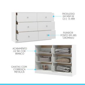 Você merece o melhor quando se trata de móveis para sua casa e a escolha certa para atender todas as suas necessidades. Com um design atual, une versatilidade, conforto e beleza. Com seis gavetas, você terá muito espaço para manter tudo organizado e ao alcance das mãos. Produzida com materiais de excelente qualidade, garantindo a sua resistência e mantendo sua beleza e funcionalidade por muito tempo. O melhor em móveis no design atual aliando conforto, qualidade e ótimos preços, só na Menu Móveis! CARACTERÍSTICAS TÉCNICAS: - Produzido em MDP de 12 e 15 mm - Acabamento UV Brilho na cor Branco - Gavetas com Corrediça Metálica - Puxadores tipo Ponto em ABS na cor Cromada INFORMAÇÕES TÉCNICAS: Altura: 80 cm Largura: 110 cm Profundidade: 36 cm Peso: 35,3 kg INFORMAÇÕES ADICIONAIS: - ATENÇÃO: Não trabalhamos e não nos responsabilizamos pela montagem do móvel. Antes da montagem conferir se o produto está de acordo com o que comprou, produto montado e danificado pela montagem não será aceito troca. - As imagens ambientadas são meramente ilustrativas e podem apresentar itens que não compõe o produto. As cores do produto podem variar de acordo com o monitor, a iluminação do ambiente ou sua percepção visual. - Limpeza: Deve ser feita com pano macio e seco ou levemente umedecido com água e sabão neutro. Não devem ser utilizados abrasivos como palha de aço e objetos cortantes. Garantia para defeitos de fabricação conforme Código de Defesa do Consumidor.