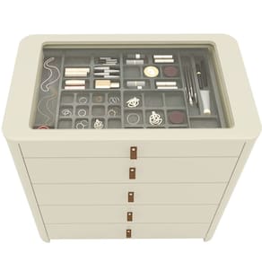 Estrutura: 100% MDF Acabamento: Pintura U.VGaveta: Sim, 05 gavetas, sendo a primeira gaveta com separação porta-joias, com acabamento aveludado, conta com corrediças telescópicas Vidro: Sim, no tampo na parte superior, realçando ainda mais a delicadeza da peça Puxadores: Sim, em poliestireno, que são semelhantes ao couro Diferencial: Cantos Curvos Design: Moderno e sofisticadoDimensões do produto montado