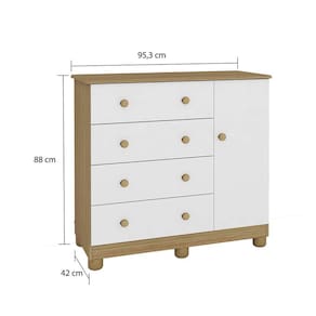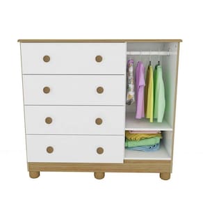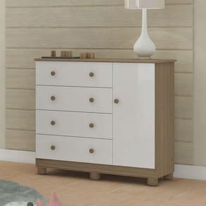 A Cômoda de Bebê Júnior foi desenvolvido para oferecer qualidade, beleza, conforto e segurança para toda família na hora de montar o quartinho do(a) bebê. É produzido com estrutura 100% MDF e acabamento em pintura UV atóxica. Possui 4 gavetas que deslizam sob corrediças metálicas, 1 prateleira que suporta até 5kg, puxadores e pés em plástico. Acompanham o produto, 2 opções de rodapés, um usinado (torneado) e outro reto, para que você escolha no momento da montagem qual se adequa ao estilo do ambiente. Aproveite para adquirir o seu agora! Acabamento da Gaveta: Pintura UV Acabamento da Porta: Pintura UV Acabamento da Prateleira: Pintura UV Acabamento dos Pés: Acompanha a Almofada: Acompanha Manual de Instalação: Sim Altura do Espelho: Altura do Espelho 01: Altura do Espelho 02: Altura do Espelho 03: Altura do Espelho 04: Altura do Espelho 05: Altura do Espelho 06: Altura dos Pés: 5.5 Ambiente: Quarto de Bebê Ambiente Principal: Quarto Infantil Complexidade da Montagem: Média: pode ser montado por mais de uma pessoa e/ou necessite de maior conhecimento para montagem Cor: Branco Brilho/Carvalho Cor: Branco Brilho/Carvalho Cor do Produto: Branco Brilho/Carvalho Cor Flex: Cor Interna: Branco Escala de Brilho: Brilhante Escala de Brilho da Gaveta: Brilhante Escala de Brilho da Porta: Brilhante Escala de Brilho da Prateleira: Semi-Brilho Espessura do Espelho: Fita Integrada: Formato do Espelho: Gaveta com Chave: Não Informações Complementares: • Fundo em HDF 3mm.• Acompanha 2 rodapés de montegem opcional, 1 reto e 1 torneado (usinado).• Acabamento Pintura UV atóxica.• 1 cabideiro metálico. Itens Inclusos: 1 Cômoda e Manual de Montagem. Largura do Espelho: Largura do Espelho 01: Largura do Espelho 02: Largura do Espelho 03: Largura do Espelho 04: Largura do Espelho 05: Largura do Espelho 06: Linha ou Coleção: Junior Manual de Especificação Técnica: Manual de Montagem e Instalação: https://cdn2.madeiramadeira.com.br/atributo/moveis-peroba/1080621-284909.pdf Material da Almofada: Material da Gaveta: MDF Material da Porta: MDF Material da Prateleira: MDF Material do Enchimento: Material do Fundo: HDF Material do Puxador da Gaveta: Plástico Material do Puxador da Porta: Plástico Material dos Pés: Plástico Material Principal: MDF Montagem Flex: Sim, rodapé reto ou usinado (torneado) Necessita Montagem: Sim Origem do Produto: Nacional Pés Reguláveis: Peso: 32.28 Peso Máximo por Gaveta: 4 Peso Máximo por Prateleira: 5 Possui Cabideiros: 01 Possui Espelho: Não Possui Nichos: Não Possui Pés: 06 Possui Portas: 01 Possui Prateleiras: 01 Possui Trocador: Não Quantidade de Espelho: Recomendações de Uso, Manutenção e Limpeza: Para limpeza utilize somente pano limpo e macio, ligeiramente umedecido em água (apenas o bastante para remover a poeira), seguido de um pano seco. Rodízio com Trava: Sapatas Niveladoras: Não Sistema de Montagem: Parafusos autoatarraxantes, conjuntos minifix, cavilha mandeira, acessórios plásticos/metálicos Suporta Até (kg): 30 Tamanho da Almofada: Tipo de Corrediça da Gaveta: Metálica Simples Tipo de Dobradiça/Corrediça da Porta: Metálica Tipo de Fixação do Espelho: Tipo de Madeira Maciça: Tipo de Madeira Maciça da Gaveta: Tipo de Madeira Maciça da Porta: Tipo de Madeira Maciça da Prateleira: Tipo de Madeira Maciça do Puxador da Gaveta: Tipo de Madeira Maciça do Puxador da Porta: Tipo de Madeira Maciça dos Pés: Tipo de Puxador da Gaveta: Externo Tipo de Puxador da Porta: Externo