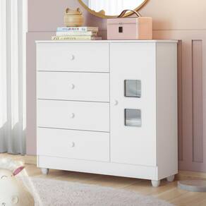 A Cômoda Infantil Life da Tigus é perfeita para o quarto do seu filho. Possui 1 porta com detalhe em acrílico, 4 gavetas, 1 cabideiro e 1 prateleira, oferecendo amplo espaço de armazenamento, mantendo todos os pertences do seu filho organizados, seguros e ao alcance das mãos. Feito em MDF de alta qualidade, garante resistência e durabilidade ao móvel. Sua belíssima cor Branca e acabamento interno brilhante, adiciona beleza e tranquilidade ao ambiente, combinando com vários estilos. Além disso, as gavetas e portas contam com dobradiças/corrediças metálicas, aumentando a vida útil, perfeitas para uma rotina cheia e eficiente. Aproveite a qualidade que Tigus Baby oferece!