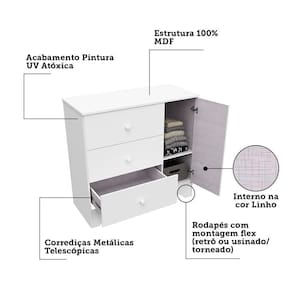 Cômoda Infantil 1 Porta e 3 Gavetas 100% MDF Cocada Branco Brilho. A linha Cocada foi desenvolvida para oferecer qualidade, beleza, conforto e segurança para toda família na hora de montar o quartinho do(a) bebê. A cômoda é produzida com estrutura em MDF e acabamento em pintura UV atóxica. Possui 1 porta, 3 gavetas que deslizam sob corrediças telescópicas, 1 prateleira que suporta até 5kg e puxadores em plástico. Acompanham o produto, 2 opções de rodapés, um usinado (torneado) e outro retrô, para que você escolha no momento da montagem qual se adequa ao estilo do ambiente. Aproveite para adquirir o seu agora! Ean: 7909903011539